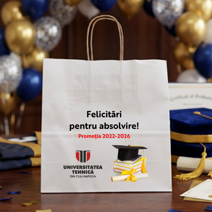 Designul curat permite personalizarea completă cu logo-ul instituției și anul promoției, transformând un simplu ambalaj într-un simbol memorabil al succesului academic.