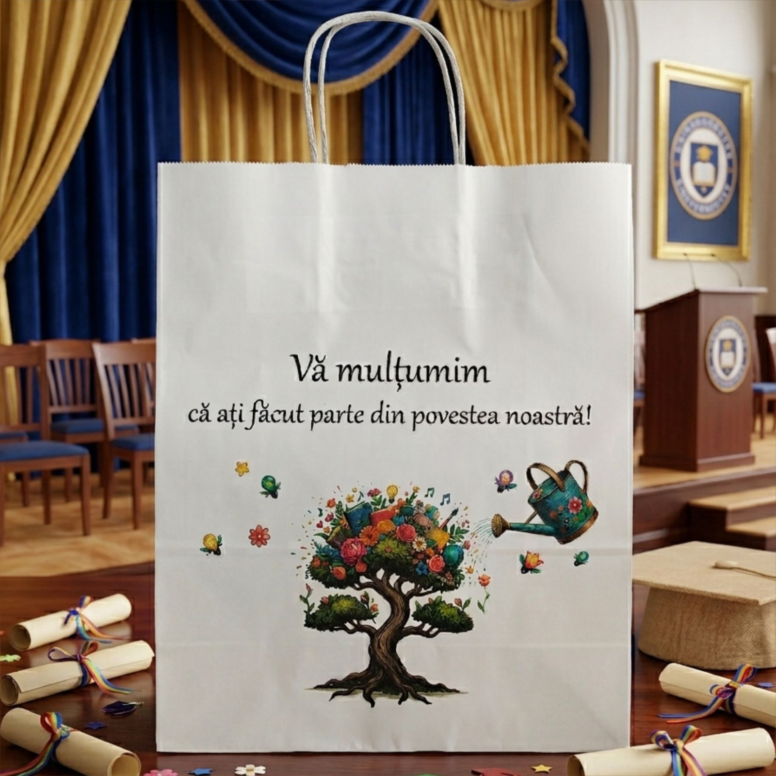 La acest set primești cadou o pungă cu tematică de absolvire, având posibilitatea de a alege între două variante de design: