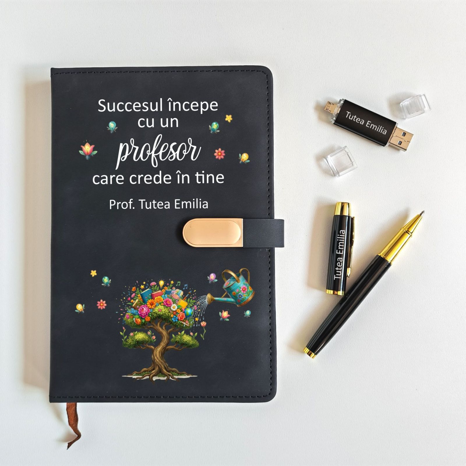 Agendă Format A5: Personalizată cu numele profesorului și un mesaj motivațional: „Succesul începe cu un profesor care crede în tine”. Include închidere magnetică și suport pentru pix.