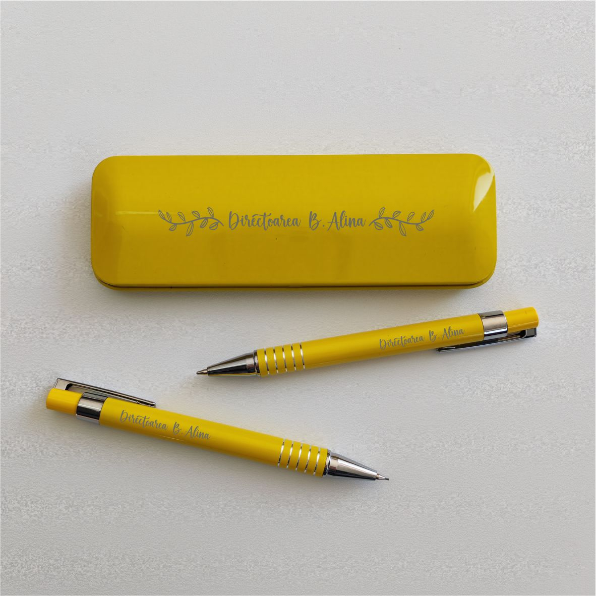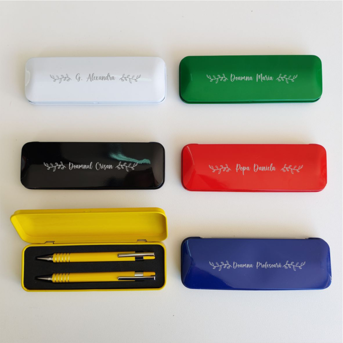 - Personalizare Completă: Putem grava numele atât pe capacul tocului, cât și pe pix și creion.