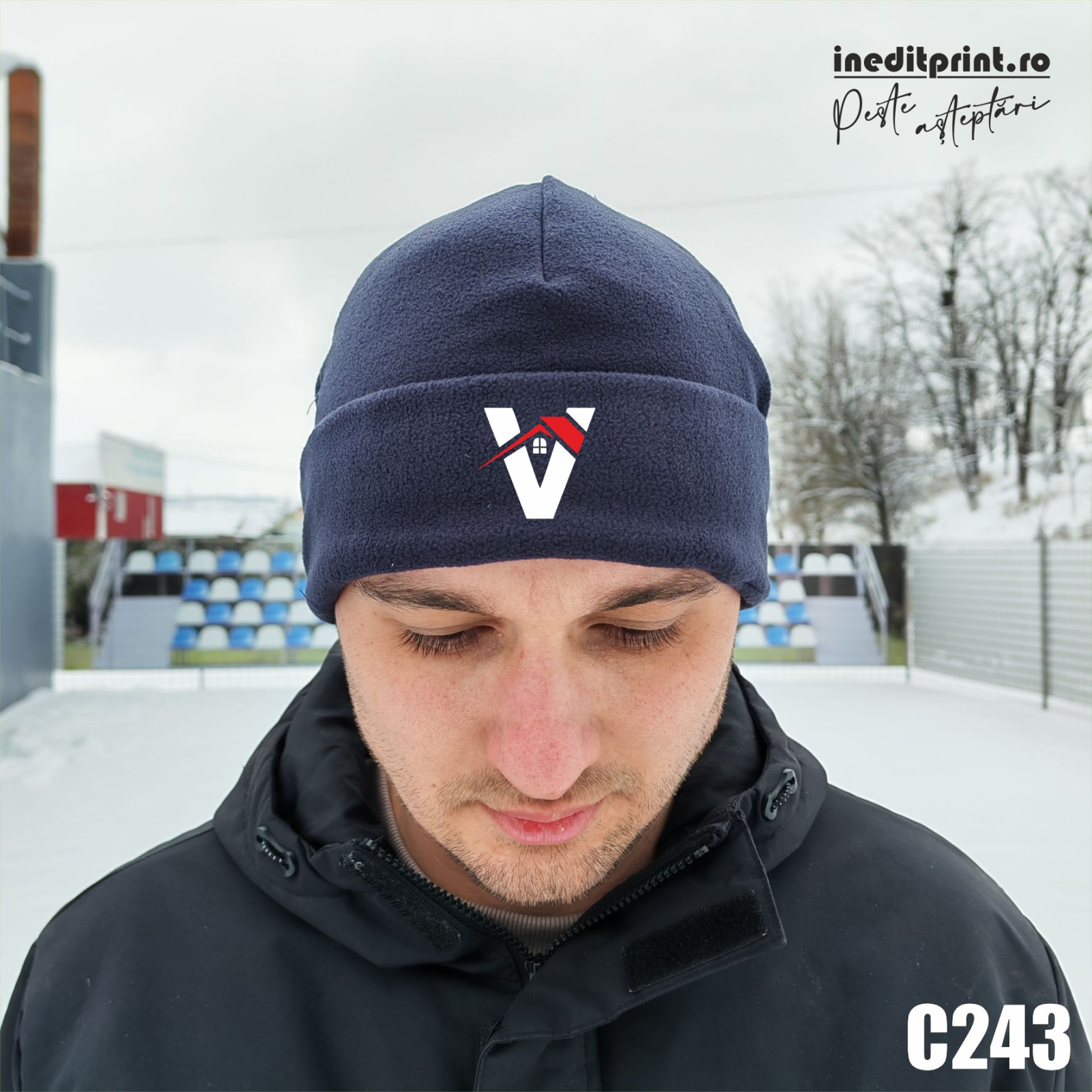 Caciulă fleece cu mânșetă decorativă, călduroasă și confortabilă, cu cusături plate și bandă dublă pentru protecție suplimentară. Personalizabilă cu nume sau logo