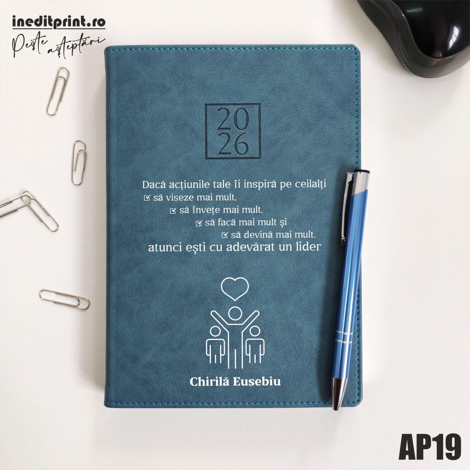 Vă rugăm să selectați modelul de agendă și culoarea dorită. Grafica prezentată ( Lider adevarat ) va fi aplicată pe modelul selectat.