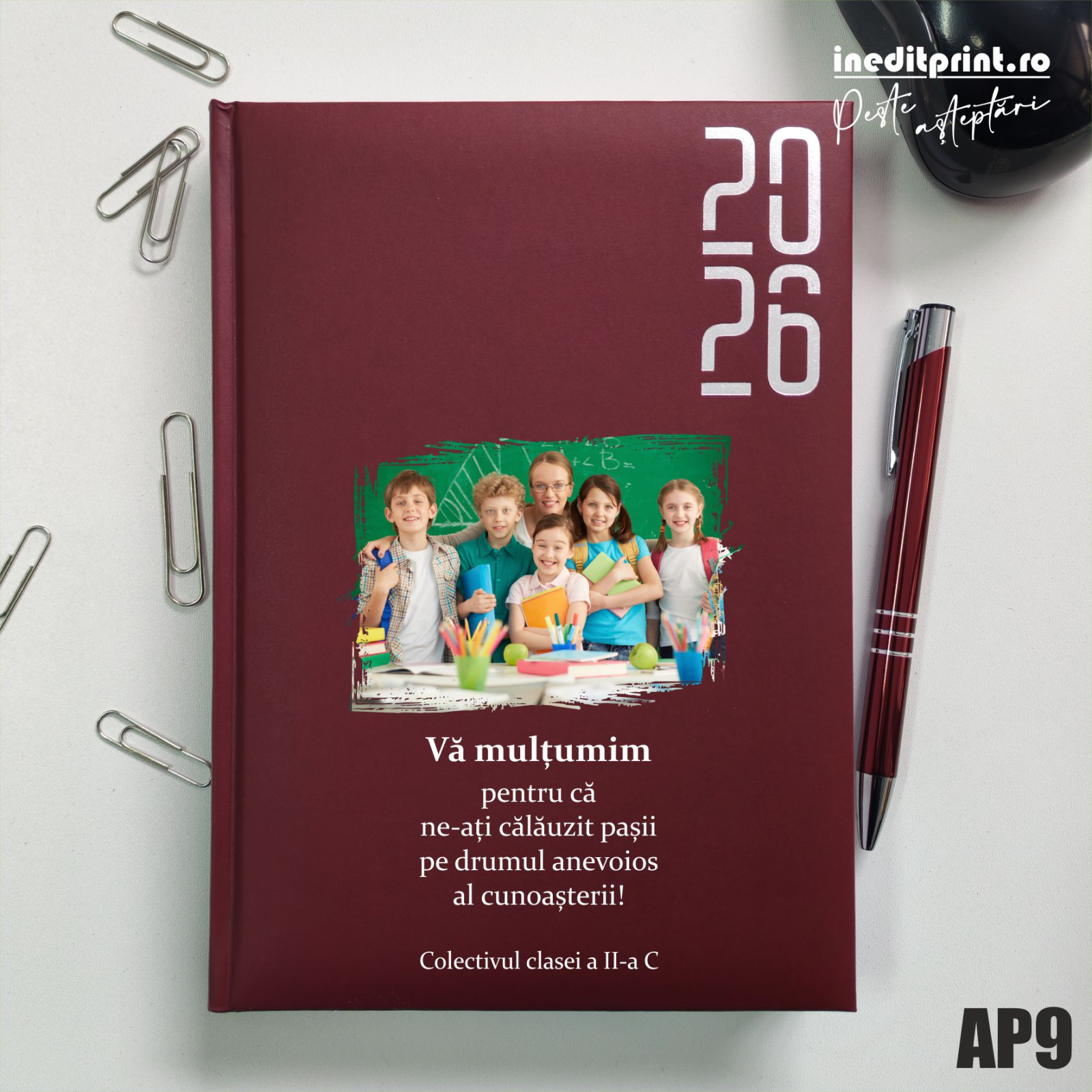 Vă rugăm să selectați modelul de agendă și culoarea dorită. Grafica prezentată (Multumiri) va fi aplicată pe modelul selectat.