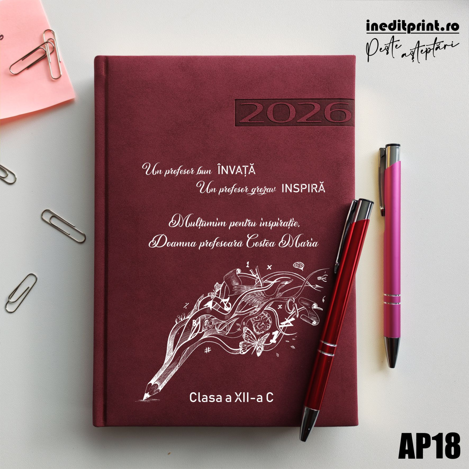 Vă rugăm să selectați modelul de agendă și culoarea dorită. Grafica prezentată ( Profesor grozav ) va fi aplicată pe modelul selectat.