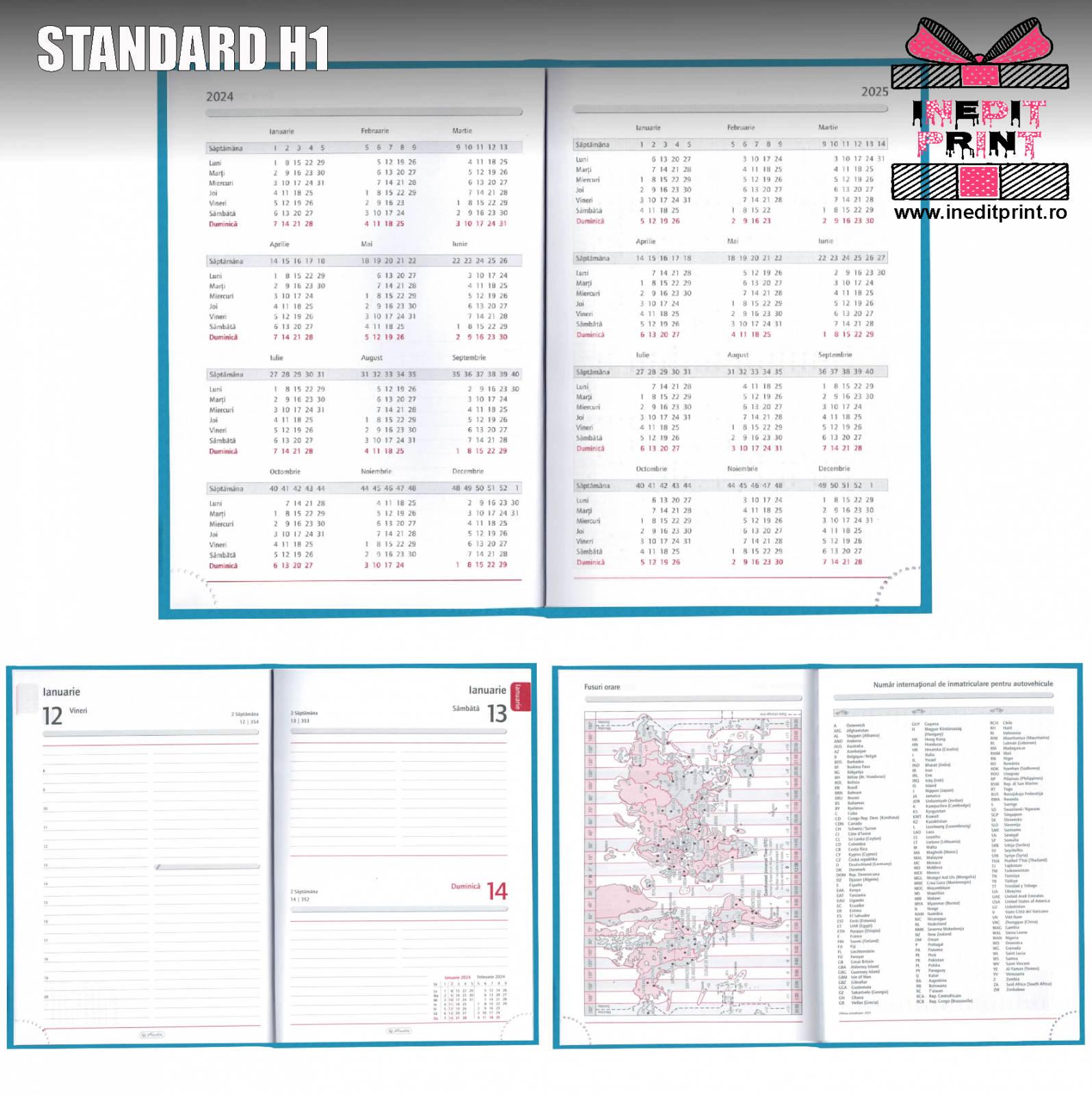 STANDARD H1 - format A5, prevazută cu semn de carte, o pagină conține o zi lucratoare, zilele de sâmbătă și duminică cuprinse pe o pagină, o pagină pentru date personale, calendar 2025 si 2026, pagini pentru notițe, agendă telefonică, harta Romaniei, copertă buretată, 352 de pagini, hârtie albă de calitate, gramaj 70 g/mp.
