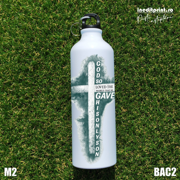 Designul imprimat pe suprafața bidonului are ca inspirație versetul biblic din Ioan 3:16 – „God so loved the world that He gave His only Son”. Crucea și textul sunt integrate într-un stil vizual simplu și expresiv, transformând un obiect practic într-o declarație de credință.