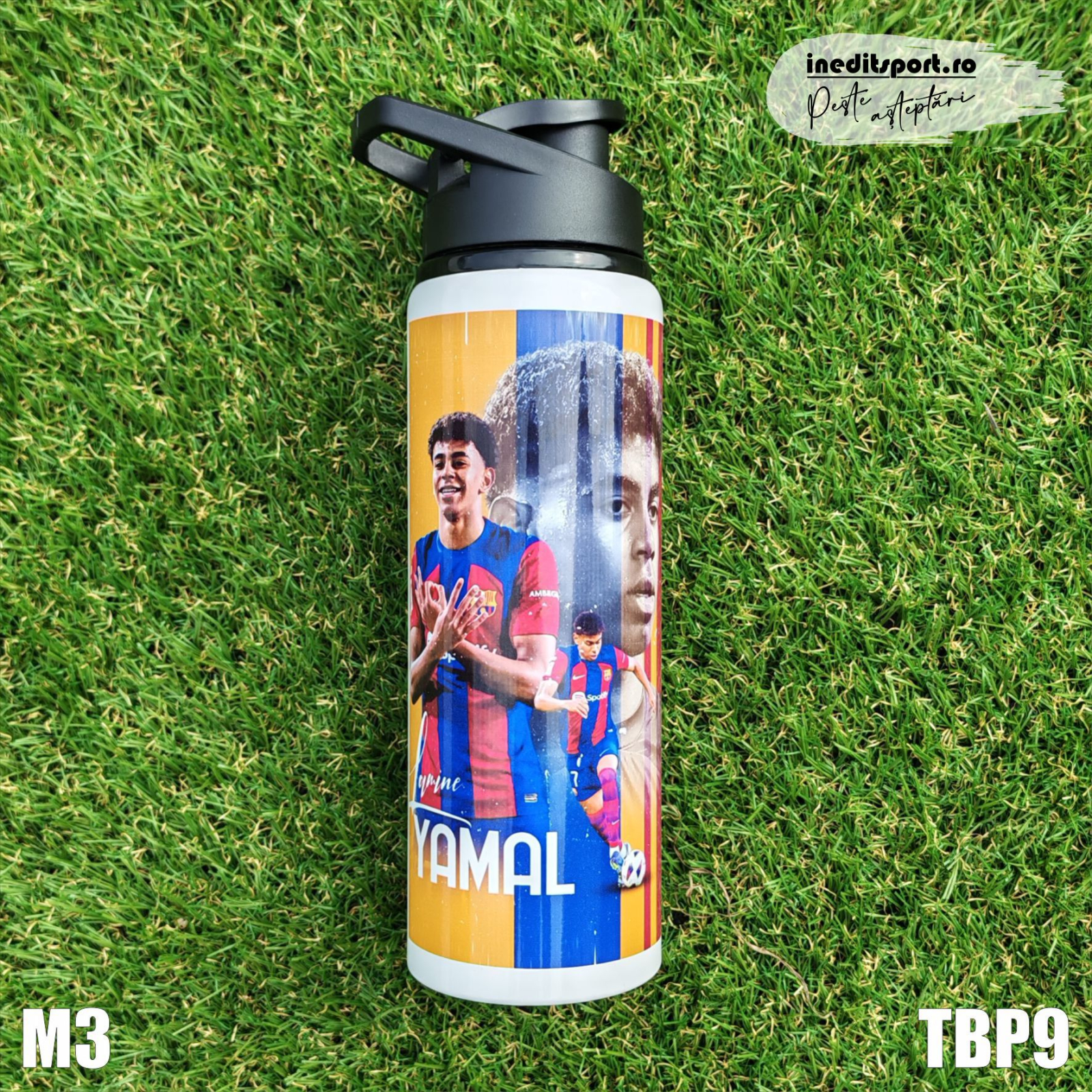 Bidonul este un accesoriu util pentru școală, birou sau antrenamente. Pe o parte are imprimată poza cu Yamal, iar pe cealaltă poți adăuga numele și numărul dorit. Este o alegere perfectă pentru fanii fotbalului, dar și un obiect practic pentru fiecare zi.