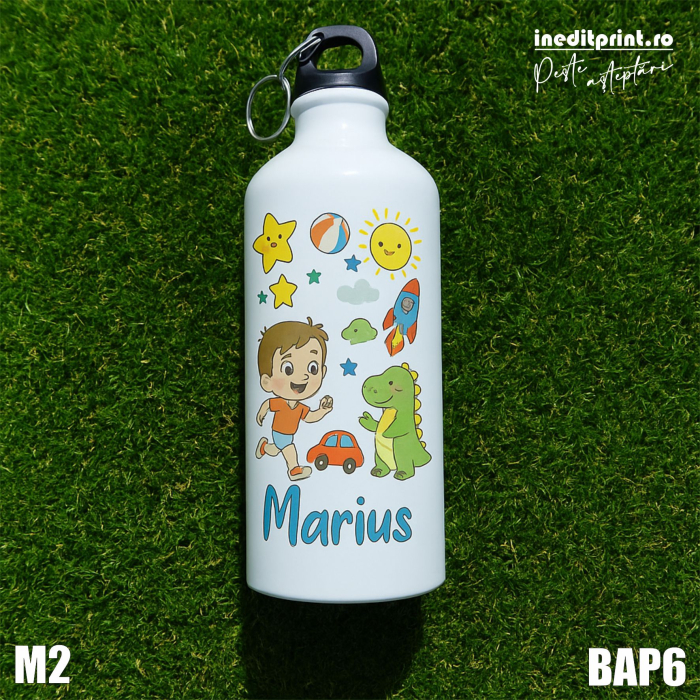 Acest bidon este gândit pentru cei mici și poate fi folosit zi de zi la școală, la grădiniță sau în călătorii. Este practic pentru a avea mereu apă la îndemână și suficient de ușor pentru a fi purtat în ghiozdan.Bidonul se personalizează cu numele copilului, astfel încât să fie ușor de recunoscut. Designul are un aspect plăcut și jucăuș, potrivit pentru copii, cu imagini colorate care fac bidonul mai atractiv și vesel de folosit în fiecare zi.