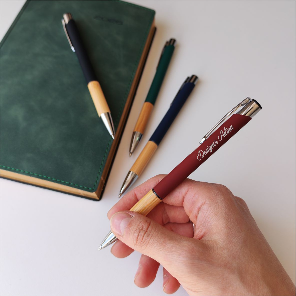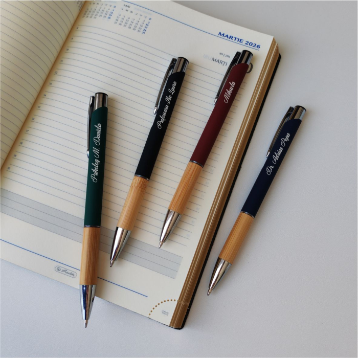 Acest pix sofisticat din linia nature combină un corp rezistent din aluminiu cu finisaj cauciucat plăcut la atingere și o zonă de prindere din bambus natural, oferind un design modern cu mecanism prin apăsare, clip metalic durabil și cerneală albastră.