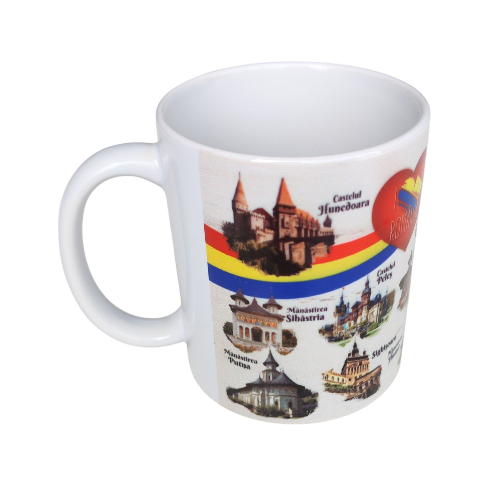 Detalii Vizuale și Design:Grafică Complexă: Suprafața cănii prezintă o compoziție vizuală detaliată, incluzând repere turistice majore precum Castelul Bran și Mănăstirea Voroneț, renumită pentru arhitectura sa unică.