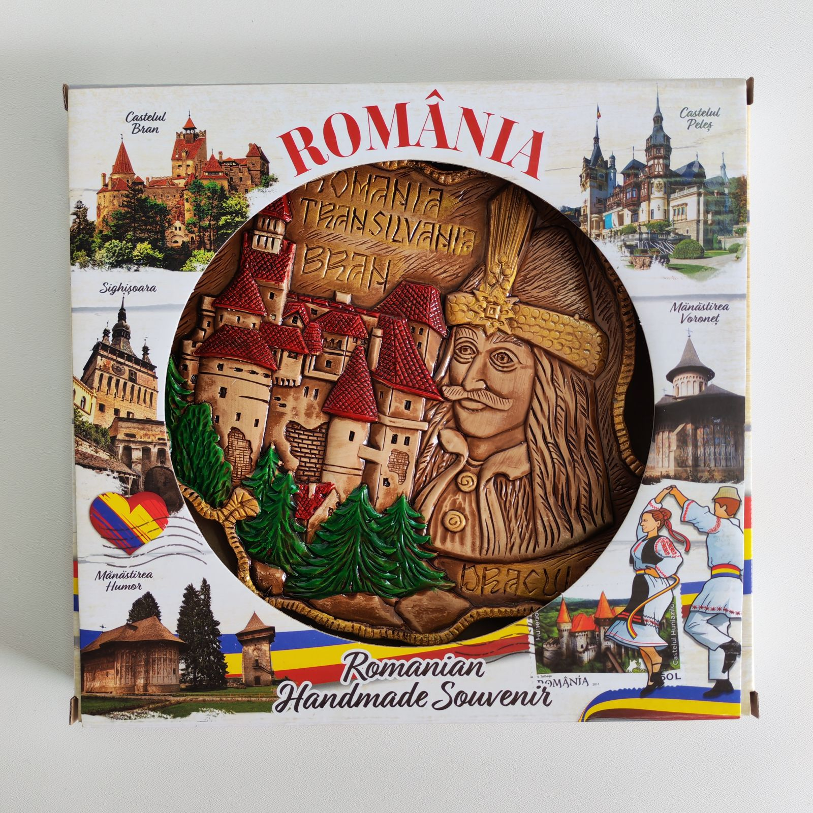 Descoperă un suvenir autentic ce reunește simbolurile legendare ale Transilvaniei într-un relief tridimensional detaliat. Realizată din compozit solid (tip ipsos) și finisată manual în tonuri rustice de maro, această piesă de 25,5 x 20 cm aduce un omagiu istoriei prin chipul domnitorului Vlad Țepeș și silueta Castelului Bran. Placheta are o grosime de 1,5 cm, este dotată pe verso cu o agățătoare metalică pentru expunere imediată și vine prezentată într-o cutie de carton ilustrată cu obiective turistice majore. Un cadou plin de însemnătate, gata de oferit pasionaților de tradiții și legende românești.