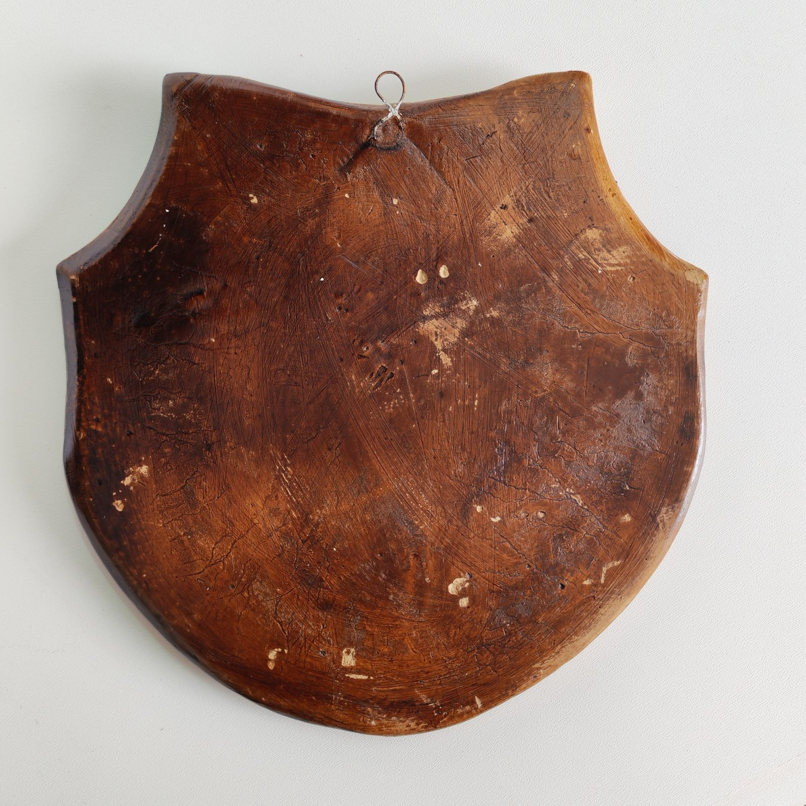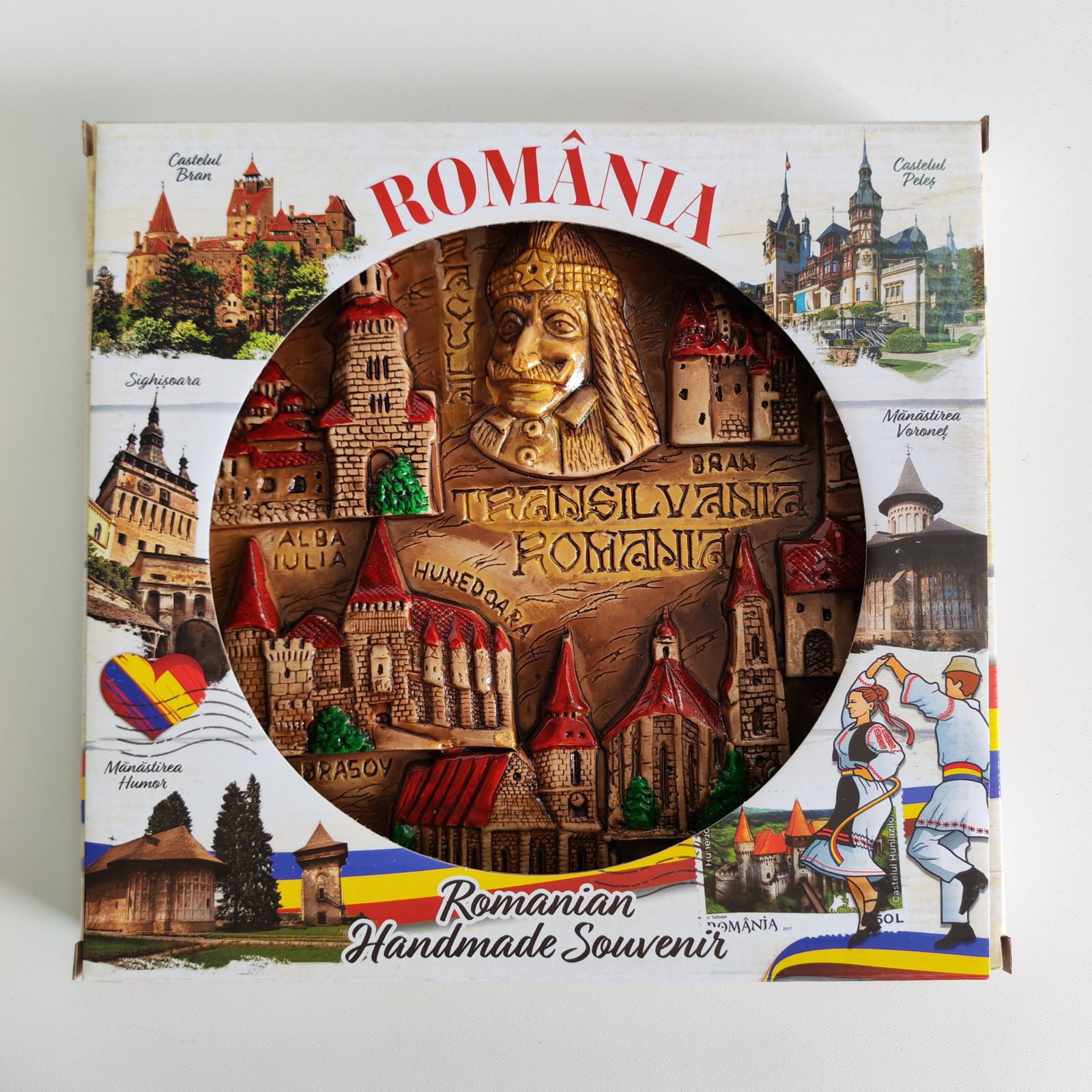 Realizat cu măiestrie din material compozit (tip ipsos), acest obiect decorativ sub formă de scut nobiliar aduce un omagiu patrimoniului medieval românesc prin detalii tridimensionale de excepție. Compoziția centrală îl scoate în evidență pe domnitorul Vlad Țepeș (Dracula), fiind înconjurat de o selecție impresionantă de repere arhitecturale din Cluj, Alba Iulia, Brașov, Sibiu și Hunedoara. Piesa se distinge prin finisajul de un maro cald, pus în valoare de accente cromatice aplicate manual pe acoperișurile roșii ale cetăților și pe elementele de decor verzi.