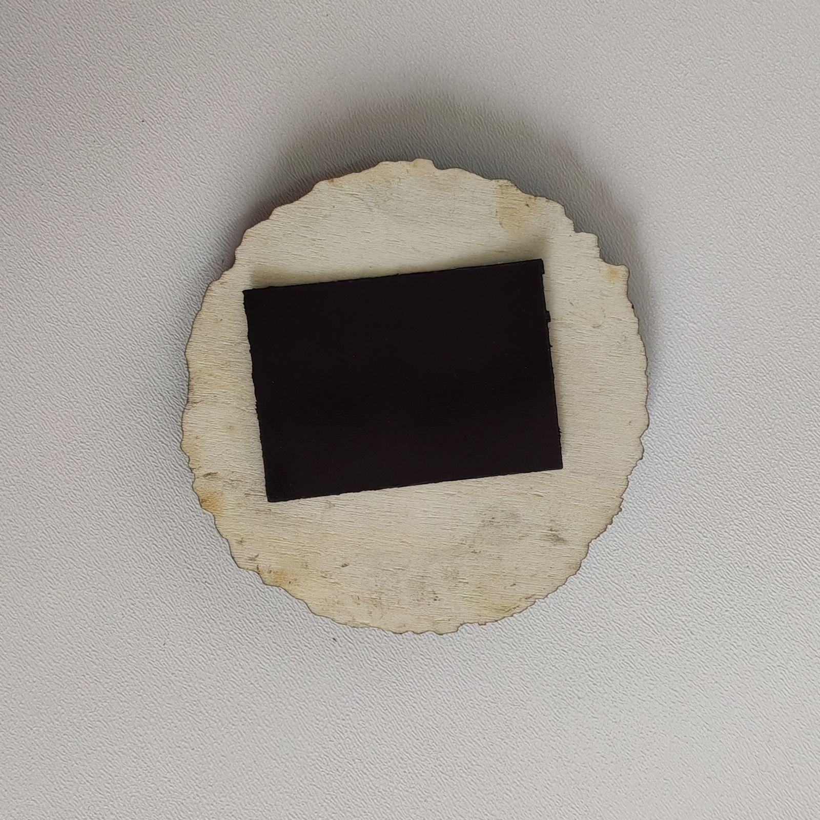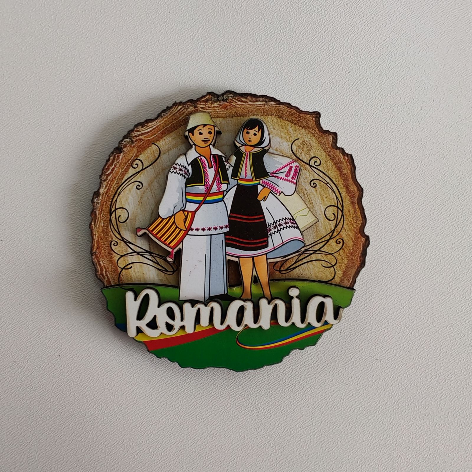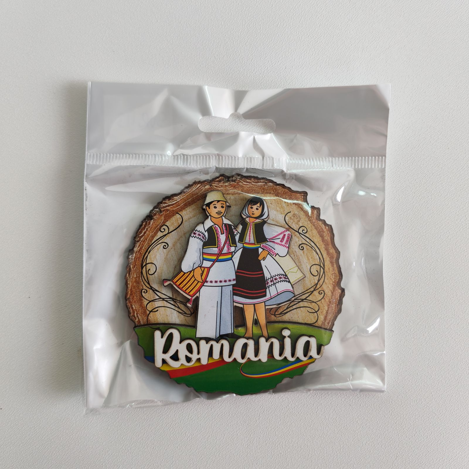 Evocând farmecul tradițiilor românești, acest magnet din lemn este realizat sub forma unei secțiuni de trunchi de copac, oferind un aspect rustic și natural. Designul central înfățișează un cuplu în port popular, acompaniat de inscripția albă „Romania” pe un fundal ce sugerează un peisaj rural autentic. Magnetul are o formă circulară cu margini neregulate, imitând scoarța de copac, și dimensiuni de aproximativ 8 cm diametru. Pe partea posterioară, este dotat cu o suprafață magnetică generoasă, asigurând o prindere fermă pe frigider sau orice alt suport metalic. Este un suvenir cald și plin de semnificație, perfect pentru a păstra vie amintirea spiritului românesc.