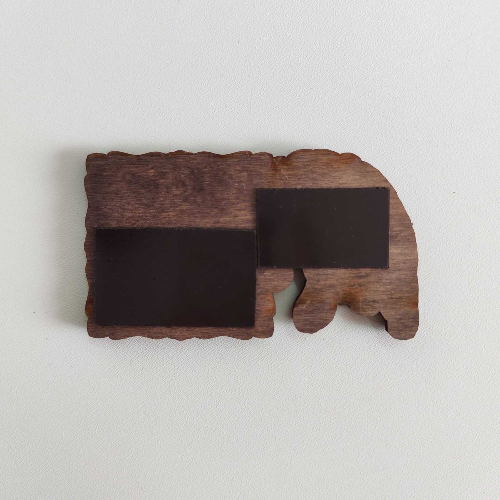 Acest magnet din lemn este realizat printr-o tehnică de suprapunere a straturilor, oferind un design 3D distinctiv. Compoziția alătură silueta impunătoare a unui urs, gravată cu atenție la detalii, unei rame rustice ce încadrează harta României. Harta este decorată cu imagini ale unor obiective turistice emblematice și elemente tricolore, fiind completată la bază de inscripția „ROMANIA”. Piesa are un stil autentic, evidențiat de contrastul dintre nuanțele naturale ale lemnului. Cu dimensiuni de 10 cm lungime și 6 cm înălțime, magnetul este prevăzut pe verso cu două suprafețe magnetice, asigurând o stabilitate sporită pe orice suport metalic. Este un suvenir robust și plin de caracter, ideal pentru a reprezenta simbolurile naturale și istorice ale țării.