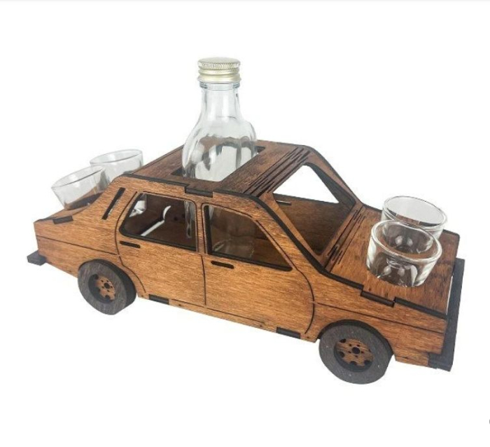 O piesă de colecție cu un puternic caracter nostalgic, acest set de servire este realizat sub forma legendarei mașini Dacia 1310. Suportul este construit din lemn finisat într-o nuanță caldă de maro, reproducând liniile clasice ale celebrului automobil, iar pe partea din spate poartă inscripția care omagiază acest model simbolic. Setul este unul complet, fiind format dintr-o sticlă transparentă, poziționată ingenios prin plafonul mașinii, și 4 pahare tip shot din sticlă, așezate în decupajele capotei și ale portbagajului. Cu dimensiuni de 31 cm lungime, 20 cm înălțime și 13 cm lățime, acest ansamblu este cadoul ideal pentru pasionații de mașini retro sau pentru oricine dorește un suvenir românesc plin de personalitate și originalitate.