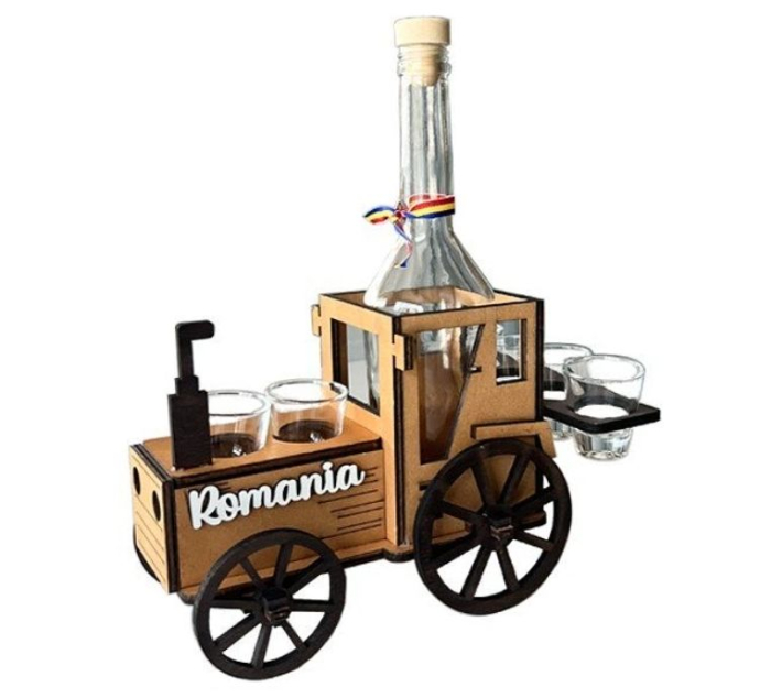 O alegere ingenioasă pentru momentele de sărbătoare, acest set de servire este realizat sub forma unui tractor în miniatură, fiind o piesă de decor cu un farmec aparte. Suportul este construit din lemn finisat cu atenție în nuanțe naturale și detalii contrastante la nivelul roților, având aplicată pe lateral inscripția albă „Romania”. Setul este unul complet, fiind compus dintr-o sticlă transparentă cu gât lung, decorată cu o fundă tricoloră, și 4 pahare tip shot din sticlă. Paharele sunt ingenios dispuse în decupajele suportului, atât în partea din față, cât și în partea din spate, asigurând stabilitatea acestora. Cu dimensiuni de 32 cm lungime, 26 cm înălțime și 17 cm lățime, acest ansamblu reprezintă un cadou memorabil sau un suvenir autentic, perfect pentru a aduce un zâmbet invitaților la orice masă.