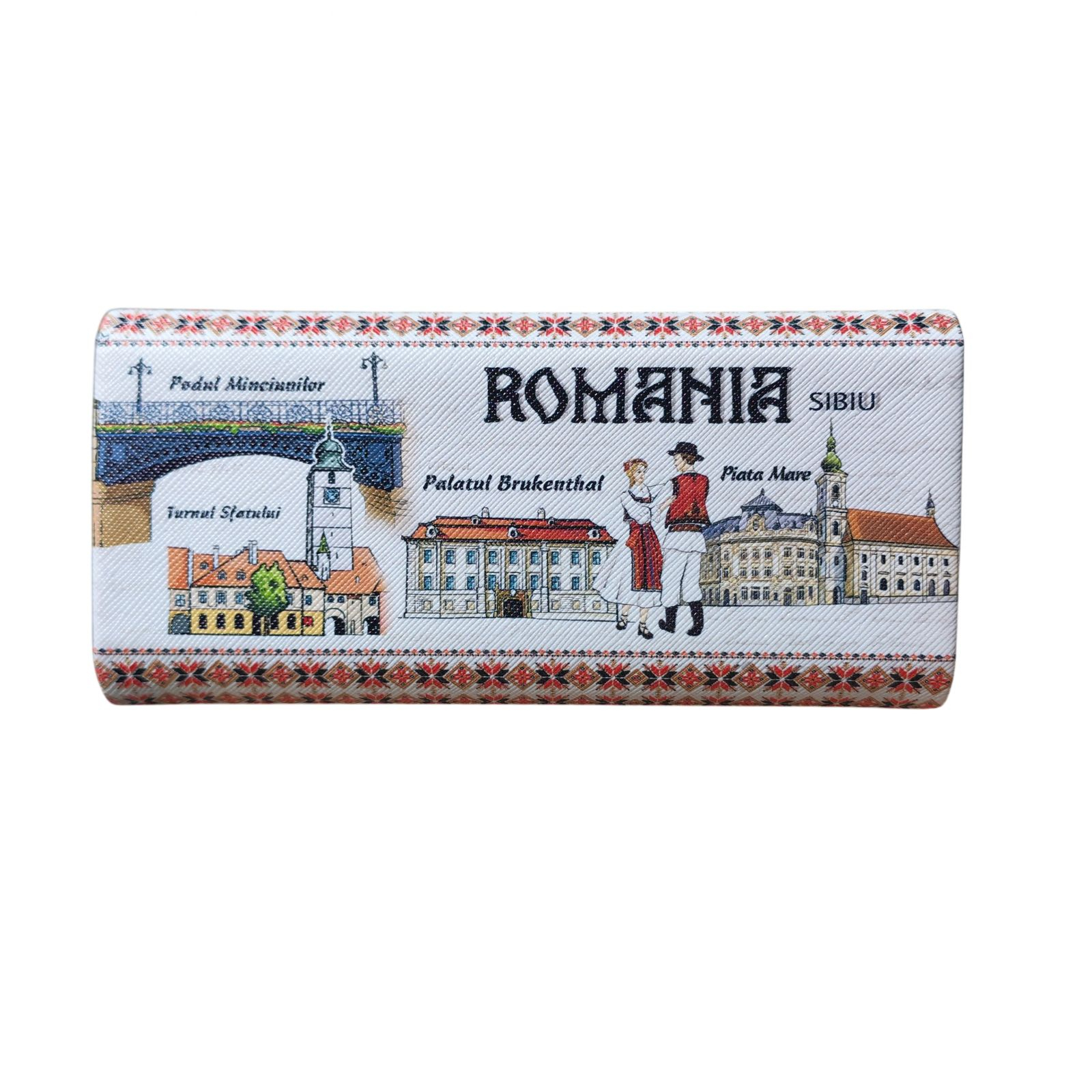 Obiective Turistice Ilustrate: Suprafața albă este decorată cu desene detaliate ale simbolurilor din Sibiu: Podul Minciunilor, Turnul Sfatului, Palatul Brukenthal și Piața Mare.