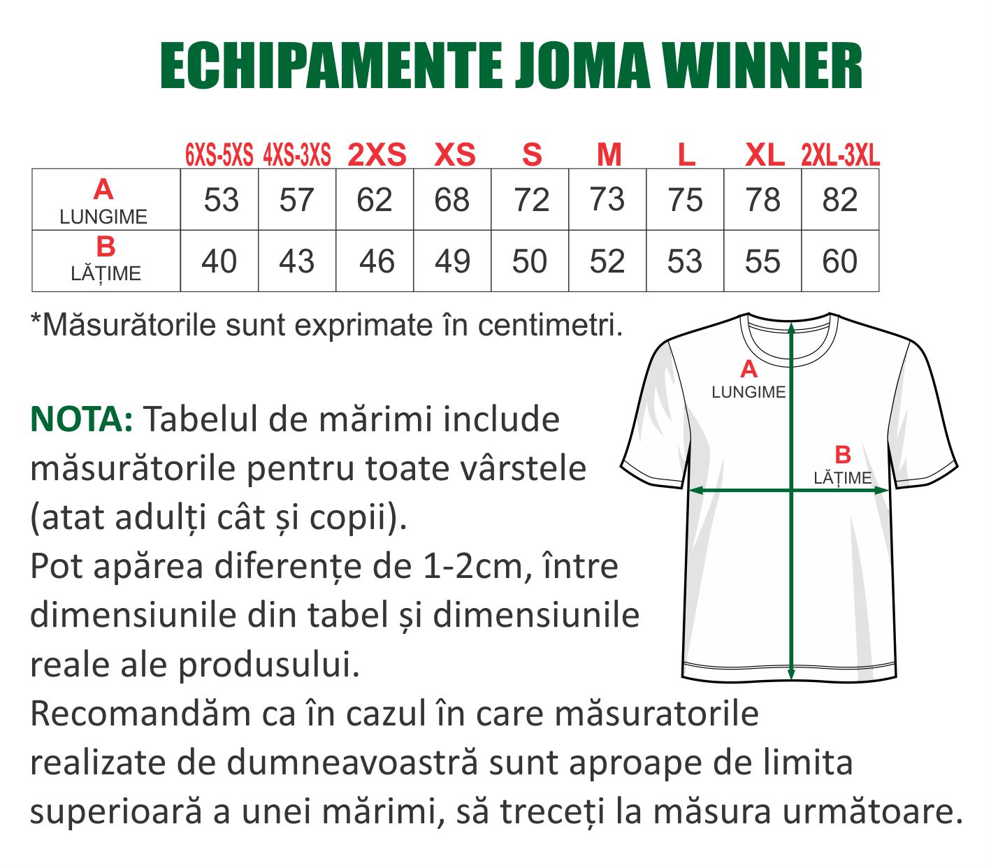 Recomandam sa urmati toti acesti pasi pentru a va asigura ca marimea aleasa de dumneavoastra este intr-adevar potrivita. Atentie, nu este suficient sa ne precizati doar inaltimea persoanei respective si greutatea, deoarece pot aparea erori. Fiind PRODUSE PERSONALIZATE cu datele dorite NU SE POT RETURNA SAU SCHIMBA.