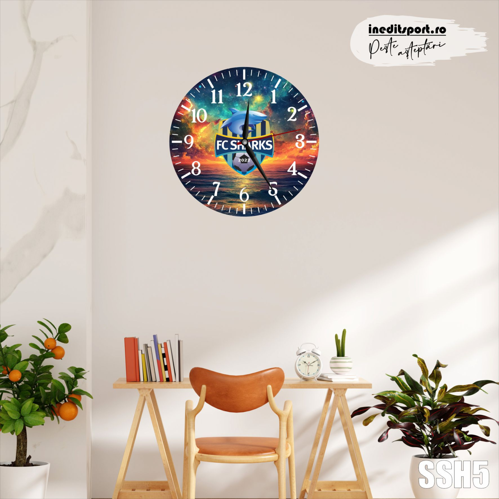 Decorează-ți spațiul cu acest ceas de perete, dedicat fanilor F.C. Sharks! Personalizată cu sigla echipei, acest ceas combină funcționalitatea cu pasiunea pentru fotbal, fiind un accesoriu perfect pentru casa sau biroul tău. Afișează-ți susținerea cu stil și fă fiecare oră să conteze alături de echipa ta preferată.