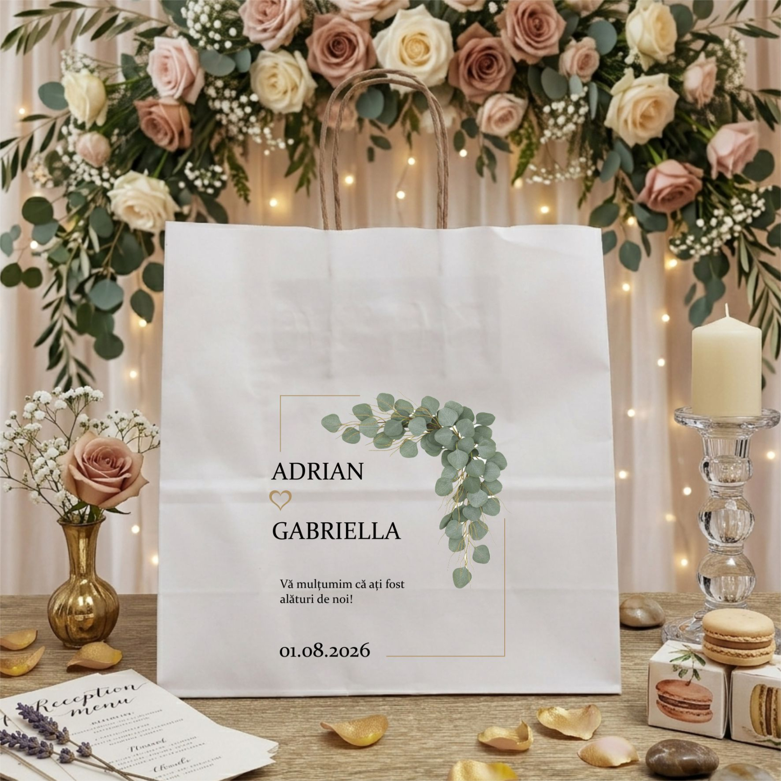 Punga cadou din hârtie personalizată cu numele mirilor și data evenimentului este modul perfect de a le mulțumi invitaților voștri.